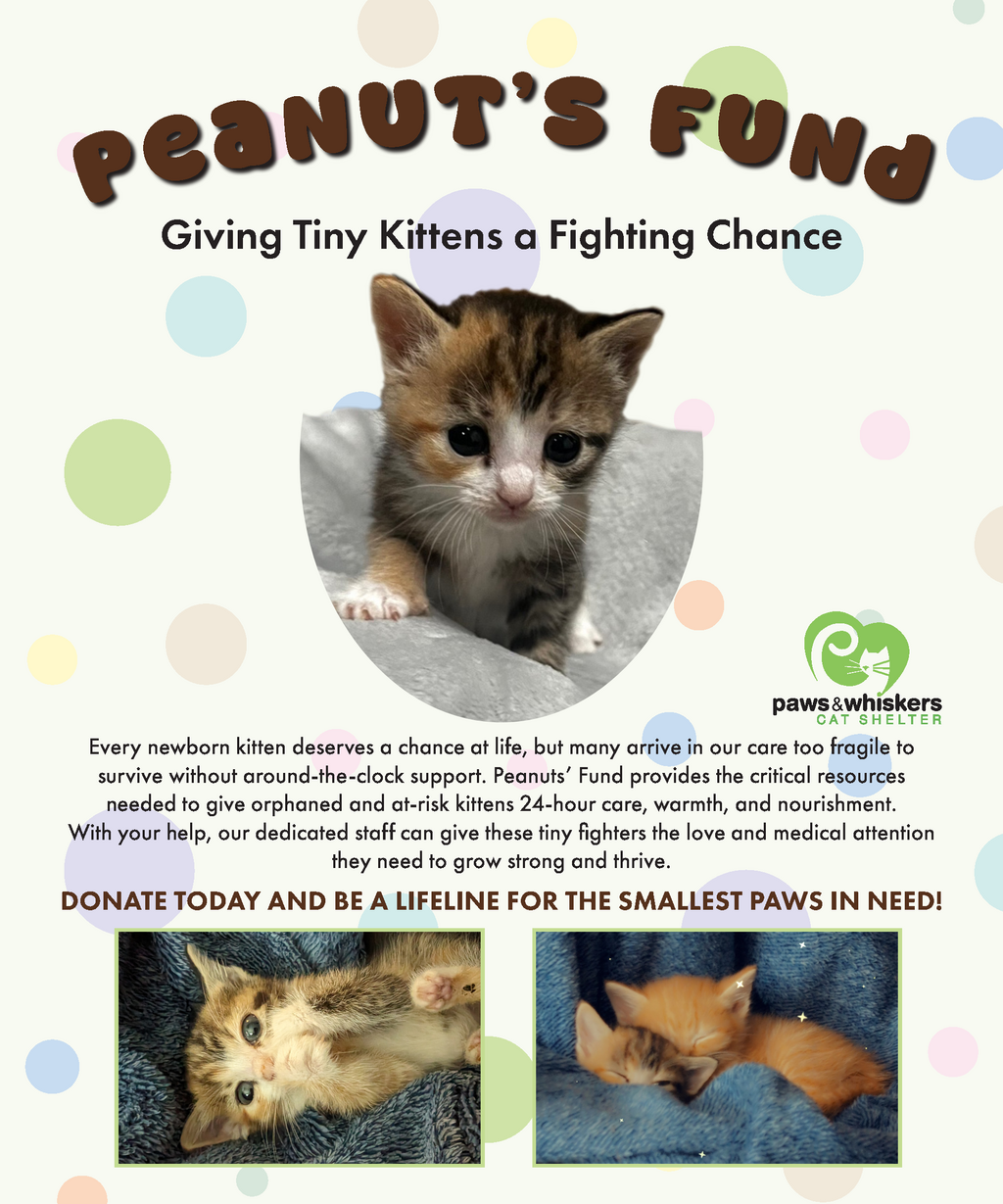 Every newborn kitten deserves a chance at life, but many arrive in our care too fragile to survive without around-the-clock support. Peanut's Fund provides the critical resources needed to give orphaned and at-risk kittens 24-hour care, warmth, and nourishment. With your help, our dedicated staff can give these tiny fighters the love and medical attention they need to grow strong and thrive.